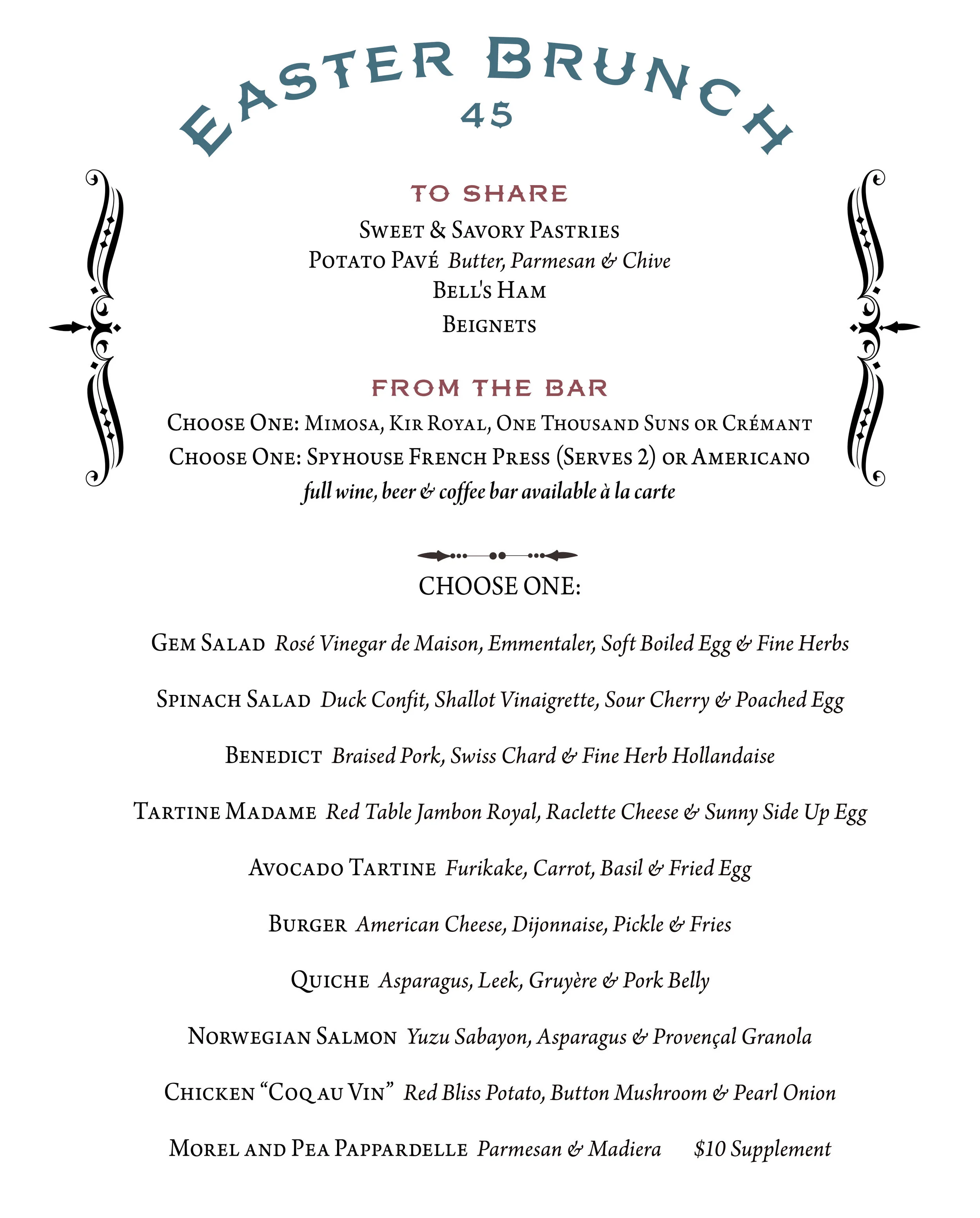 Our Easter brunch includes plates to share, an entrée of your choice, coffee, and a sparkling beverage. The menu is $45/guest and is exclusive of tax and service. Children under 12 will also be offered a special menu for $15/guest. We hope to see you there!