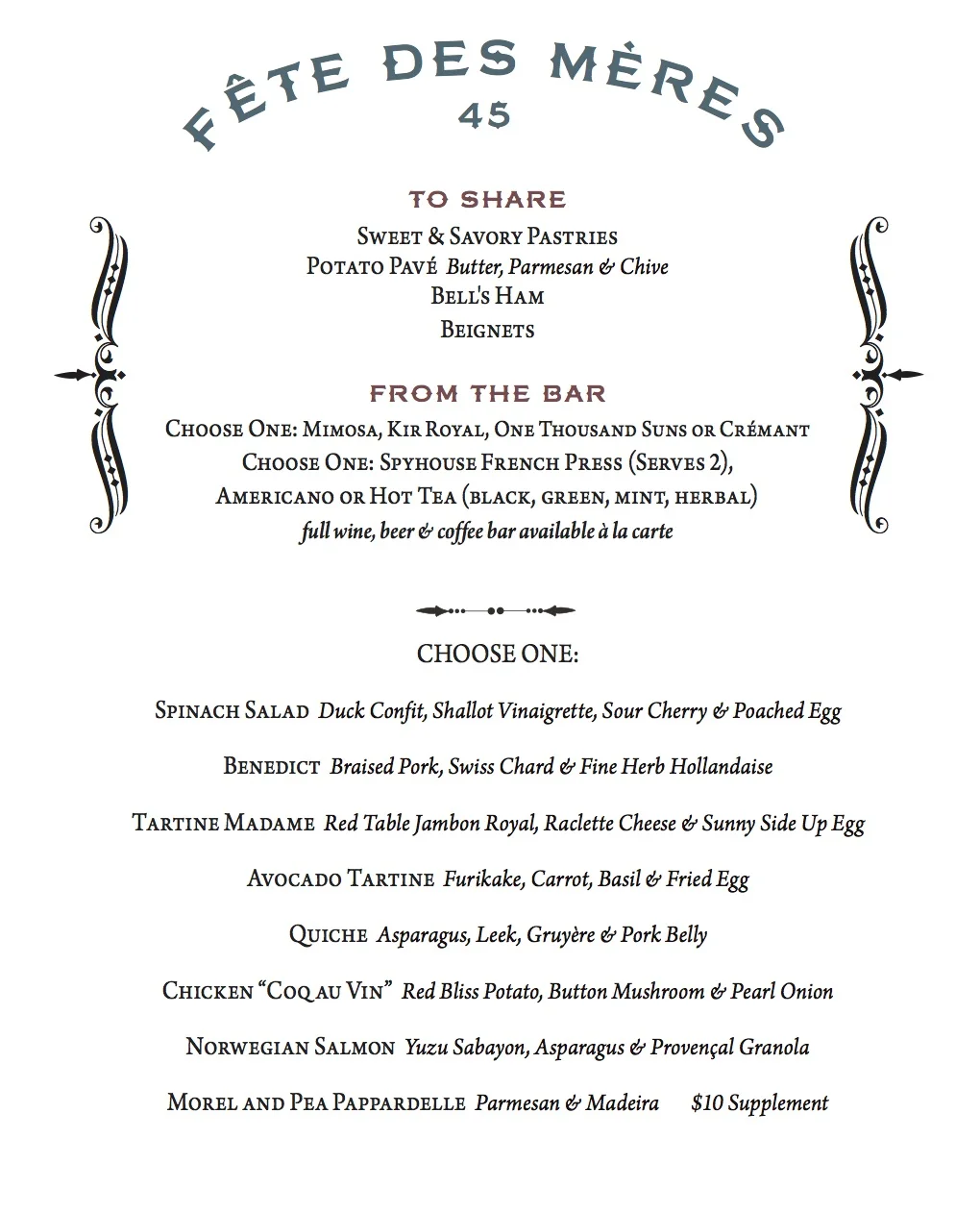 Our Mother's Day brunch includes plates to share, an entrée of your choice, coffee, and a sparkling beverage. The menu is $45/guest and is exclusive of tax and service. Children under 12 will also be offered a special menu for $15/guest. We hope to see you there!