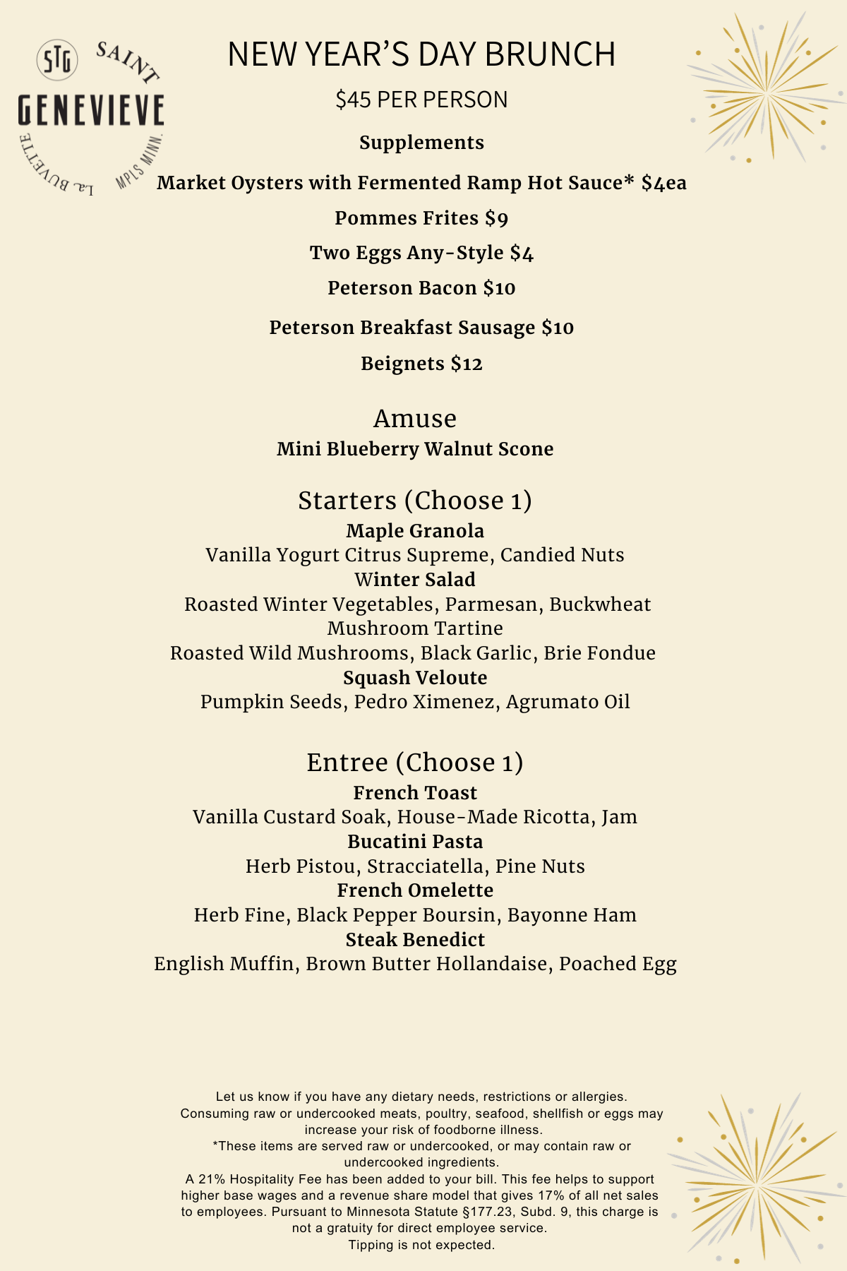 Join us to welcome the New Year with Brunch at St. Genevieve we will be offering a three course brunch menu for $45.00 on New Year’s day! Please click here to view the menu. Reservation are available through Tock.